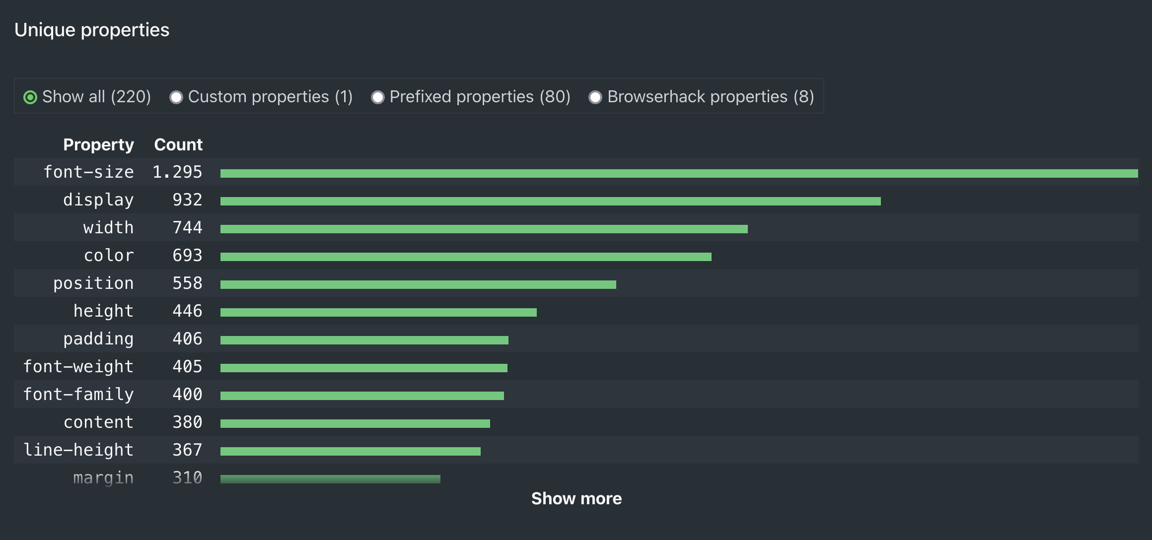 To keep the report somewhat easy to digest, I’ve made a component that only shows the top ~15 items when there’s a long list of things. The properties-list and media queries are a good example of this. When there are many properties, like the 220 unique properties on CNN.com, we don’t want to scroll for ages to get to the next section, unless you intentionally want to view them all.